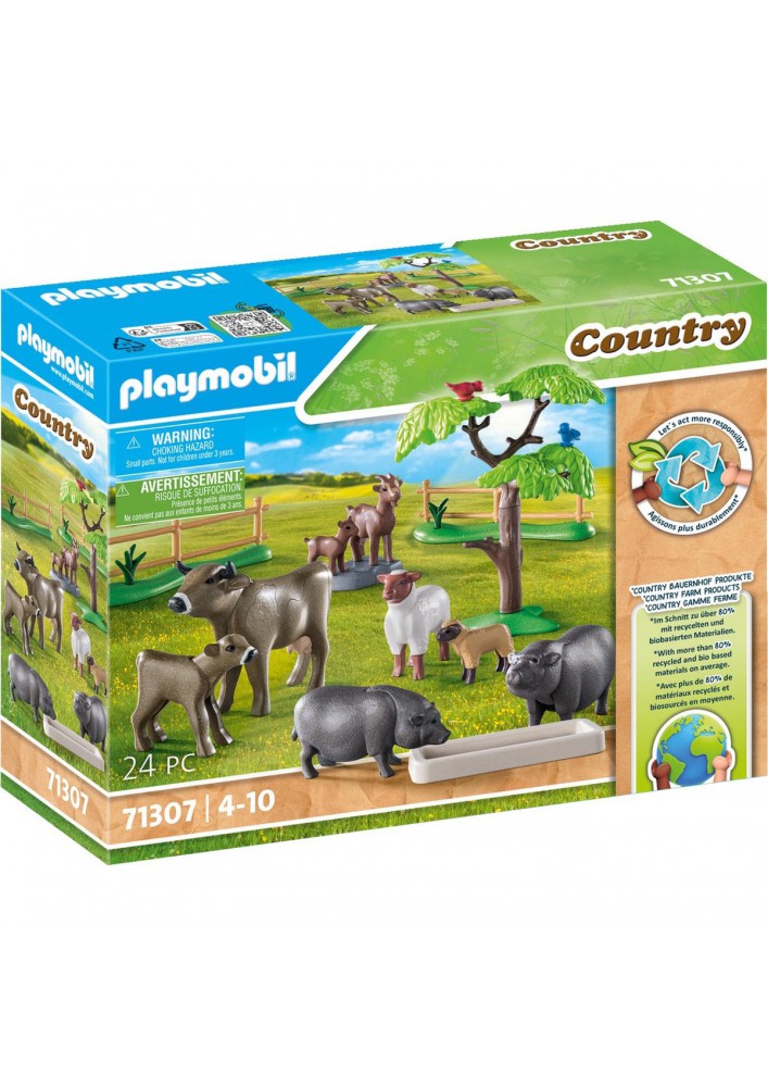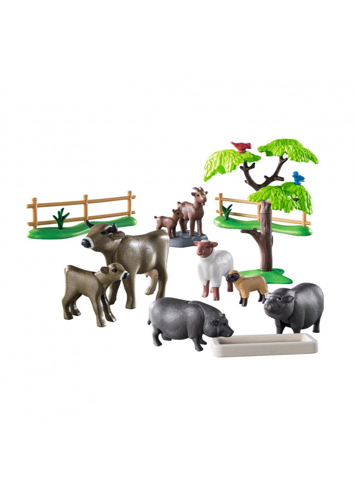 Is er nog plaats op jouw boerderij? Laat deze geweldige boerderijdieren dan bij je intrekken. Koeien, geiten, schapen en hangbuikzwijntjes verheugen zich op een gezellig thuis in de stal en op de wei, waar ze goed worden verzorgd. De PLAYMOBIL-boerderijwereld laat kinderen vanaf 4 jaar het leven en werk op het platteland van een nieuwe kant ontdekken. De gedetailleerde speelfiguren en dierensets inspireren keer op keer tot nieuwe verhalen, waarin zorgvuldig gebruik van onze natuurlijke hulpbronnen een natuurlijk onderdeel is van het dagelijks leven. Deze liefdevol vormgegeven dierenfigurenset bevat een koe met kalf, een geit met geitje, een schaap met lam, twee hangbuikzwijntjes en twee vogels.