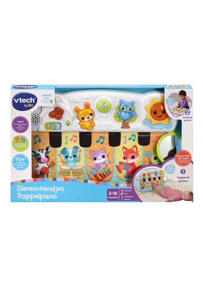 De 5 zachte pianotoetsen laten kleintjes kennismaken met dieren, muziekinstrumenten en gezongen liedjes. Bevestig de piano aan een box of leg hem op de grond om er zittend mee te spelen. De gekleurde lichtjes trekken de aandacht en knipperen mee met de muziek. Bevat 2 speelstanden: Leren en Muziek. Beweeg de uil om 15 minuten rustgevende muziek te horen of druk op het konijn om 15 minuten vrolijke muziek te horen. Het spiegeltje draagt bij aan de ontwikkeling van het zelfbewustzijn. Het stof van de piano is oppervlakkig afwasbaar. 7 gezongen liedjes en 20 melodietjes. Nederlands gesproken. Stevig en duurzaam design. Regelbaar volume. Automatische uitschakeling. Geschikt voor kinderen vanaf 3 maanden.