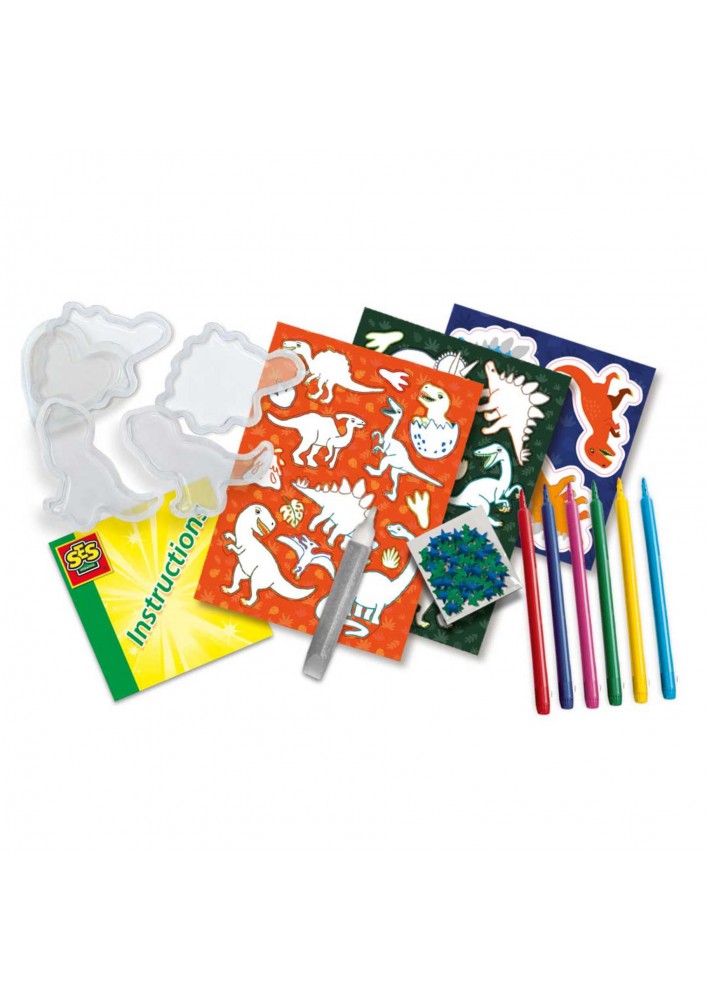 Ontwerp en maak je eigen dino stickers. Kleur je dino in, vul de shaker met de verschillende pailletten en plak de dino kap eroverheen. Naast de dino shaker stickers zitten er nog twee stickervellen vol dinosaurussen in. Deze kun je inkleuren met de viltstiften en extra versieren met de glitterlijm. Geschikt voor kinderen vanaf 5 jaar.