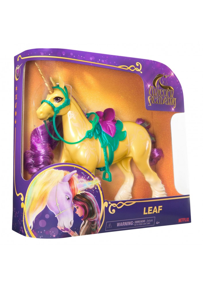 Unicorn Academy - Eenhoorn Leaf, geschikt voor Ava modepop. Inclusief afneembaar hoofdstel en zadel, met geluidseffecten en verlichting. Werkt op 2 LR44 batterijen (inbegrepen). Gemaakt van kunststof. Voor kinderen vanaf 4 jaar.