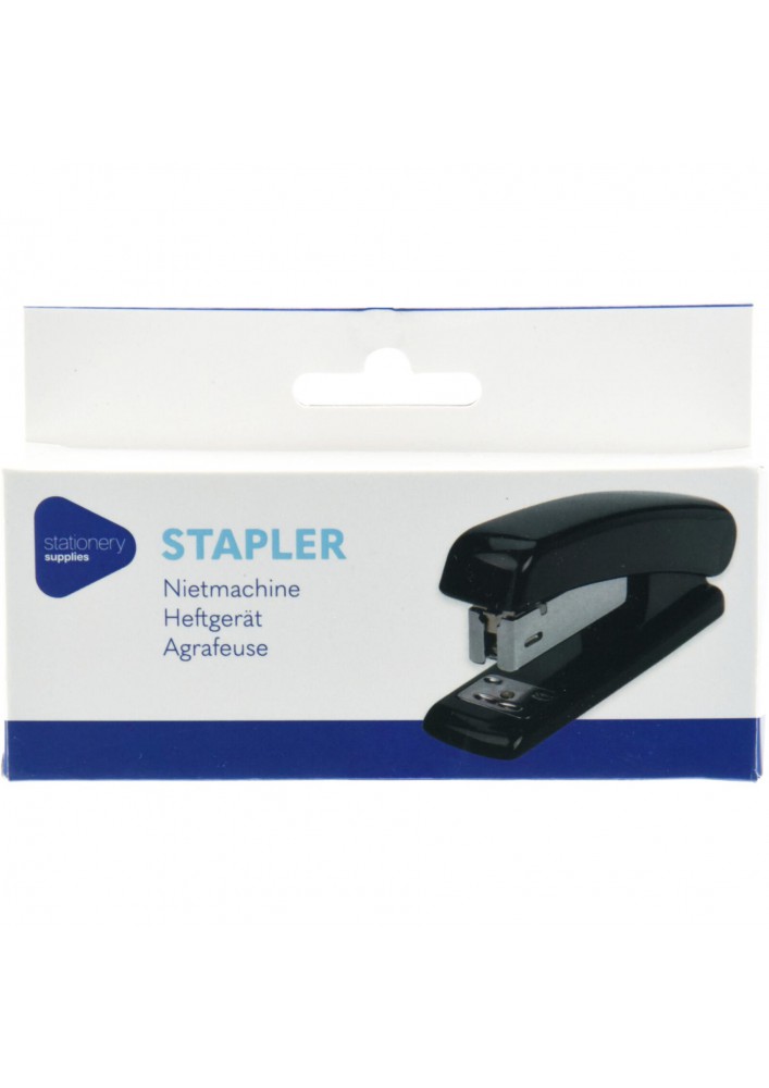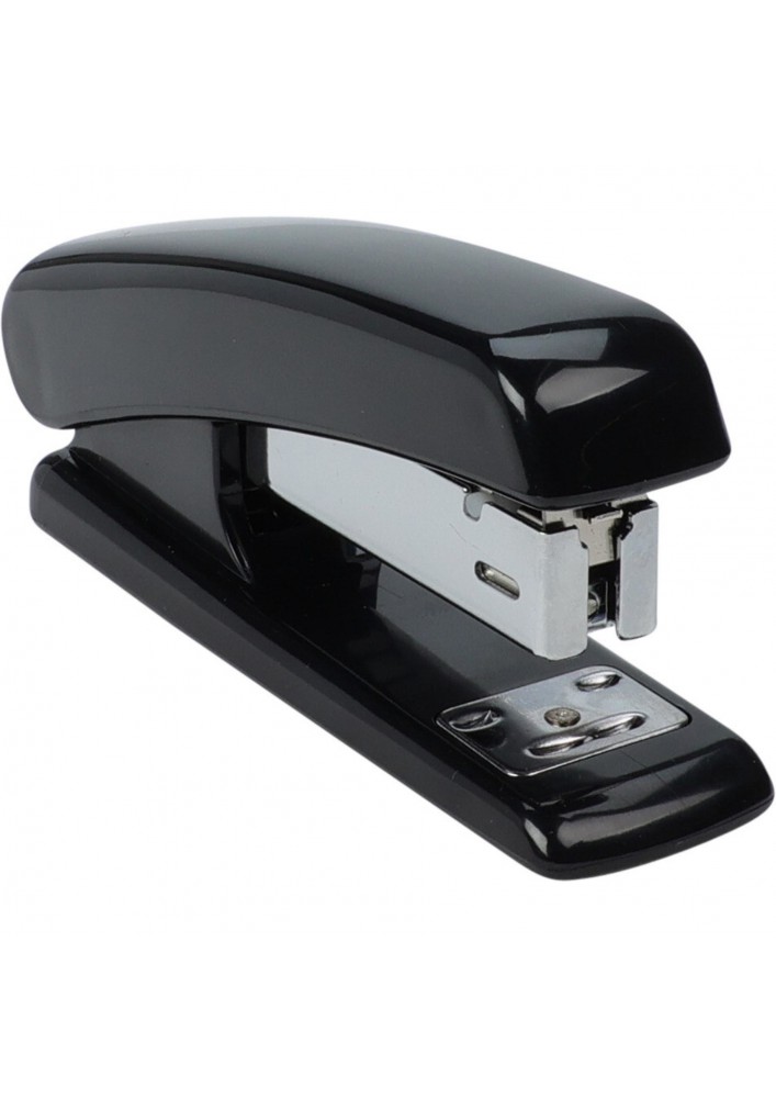 Zwarte nietmachine gemaakt van staal, met een afmeting van 13 x 4 x 9 cm. Geschikt voor kinderen vanaf 12 jaar en ideaal voor gebruik op scholen en kantoren.
