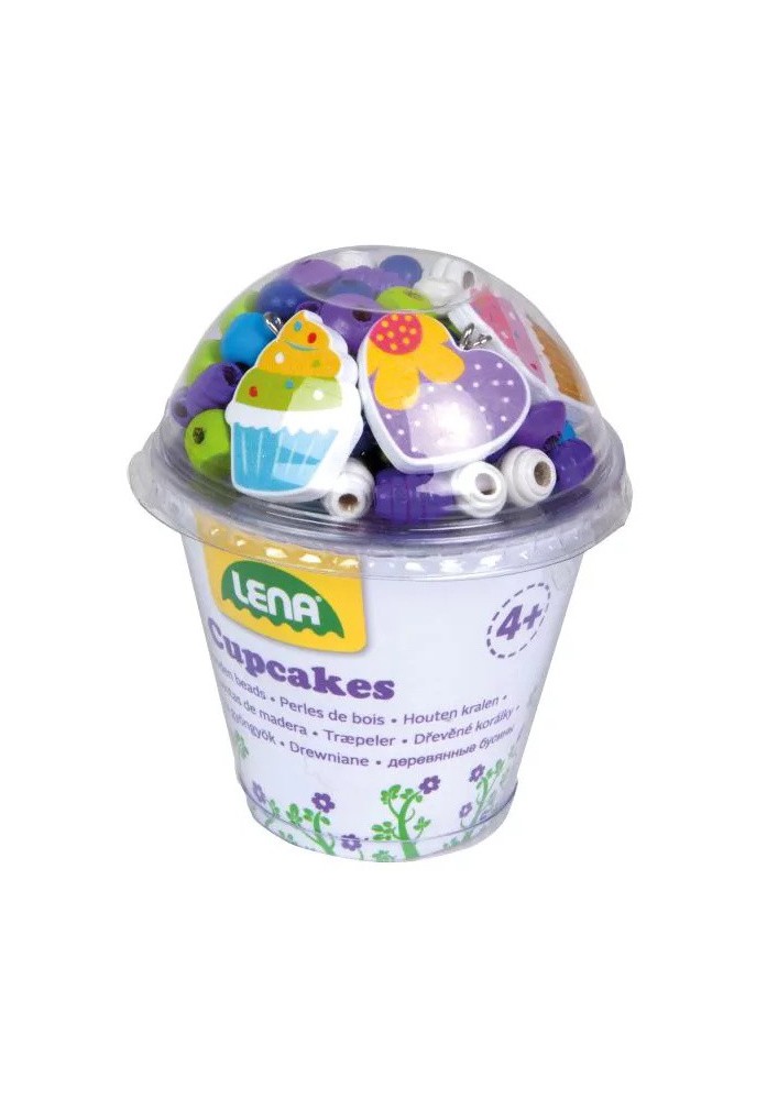 Cupcake, voorzien met ca. 200 houten kralen en 3 hangers, waarvan 3 koordjes.