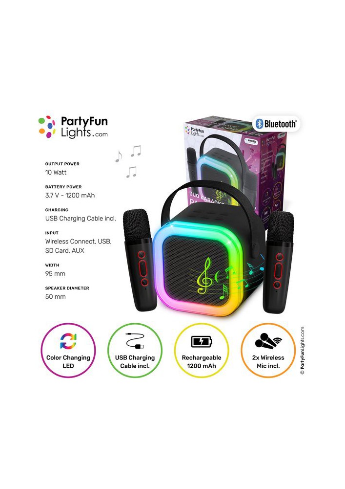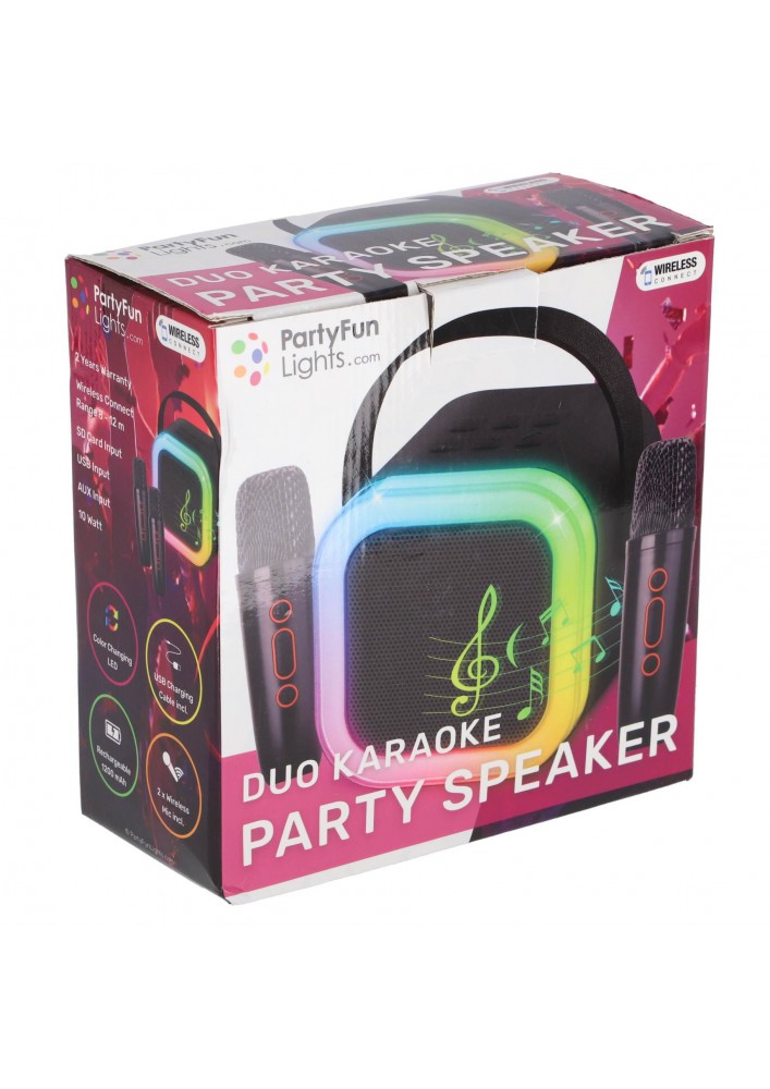 Deze compacte karaoke set van Partyfunlights moet je in huis hebben! Gezellig samen zingen met deze complete karaoke set brengt elk feestje tot leven! De set wordt geleverd met krachtige luidsprekers, twee microfoons en kleurrijke LED-verlichting voor een echte feestervaring. Sluit eenvoudig je telefoon of tablet aan via wireless connect en zing mee met je favoriete nummers. Perfect voor feestjes, verjaardagen of gewoon een gezellige avond met vrienden en familie!
