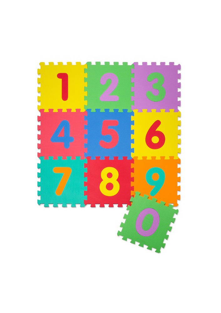 Cijfers puzzelmat, 10 tegels met cijfers 0 t.e.m. 9. Ondersteunt de verstandelijke ontwikkeling, motoriek en verbeelding van kinderen. De puzzelstukken zijn extra zacht, duurzaam en veilig dankzij de-foam waaruit ze gemaakt zijn. Ze zijn ook heel gemakkelijk te onderhouden en warmte-isolerend zodat je kinderen beschermd zijn tegen koude vloeren. Leg de tegels neer als een mooie kleurrijke speelmat of bouw kubussen met de tegels. Je kan de cijfers ook uit de tegels halen. Maak een mat die perfect past in jouw speelkamer. De speelmat zal je vloer bovendien beschermen tegen krassen van speelgoed. Afmetingen van 1 tegel: 30x30 cm.