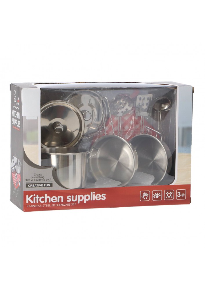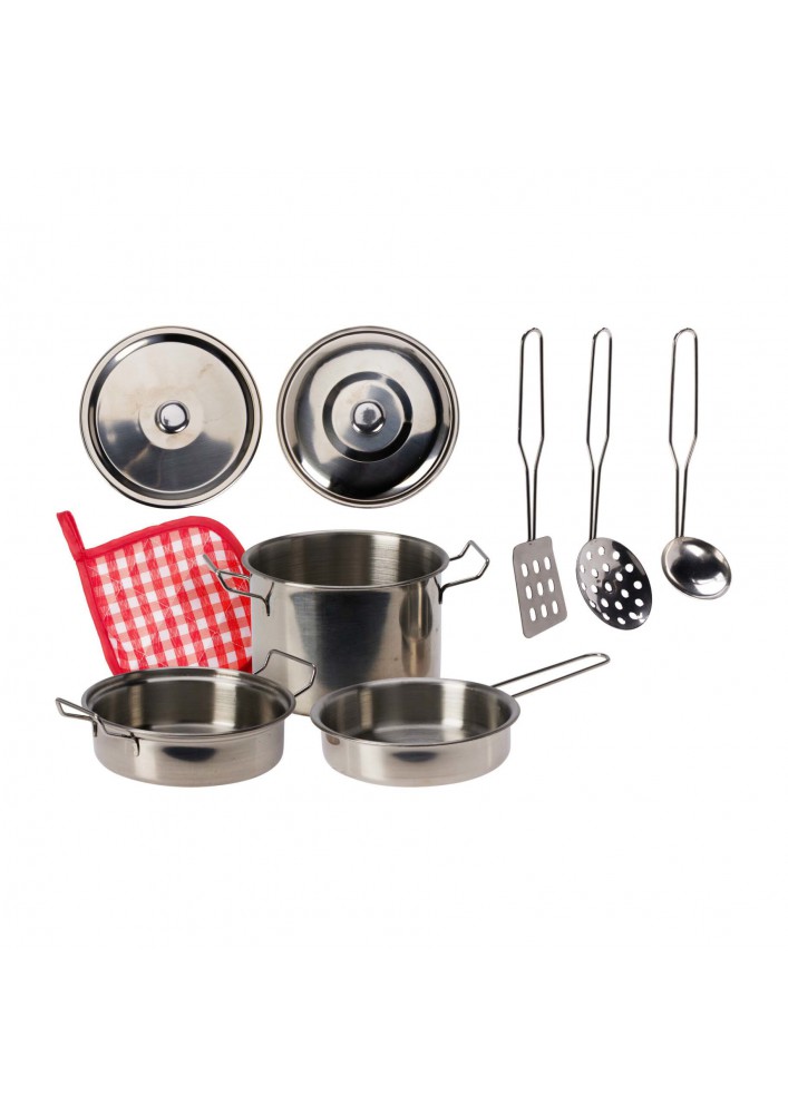 2 pannen, 1 soeppan met deksel, pollepel, Spatel, schuimspaan en pannenlap