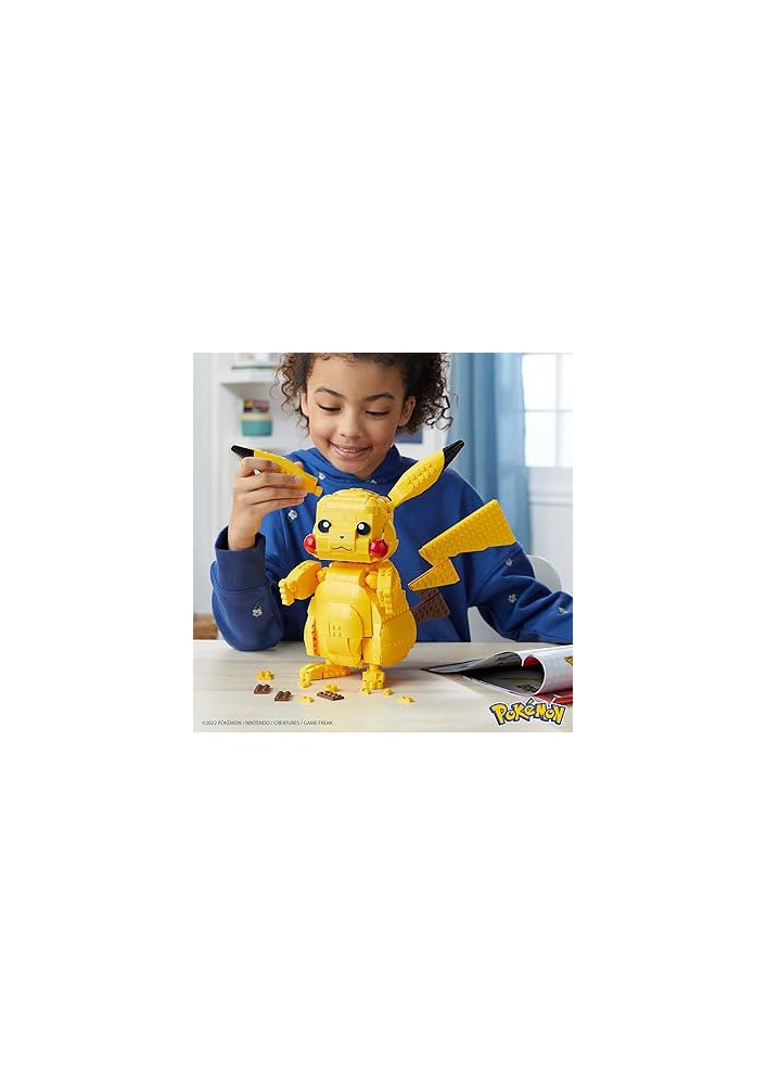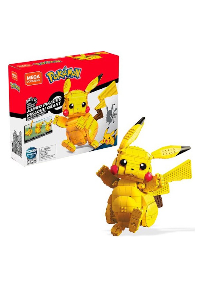 Mega Construx Pokémon Jumbo Pikachu. Mega Construc bouwpakket van een 32 cm grote Pikachu. De Pokémon bestaat uit 806 bouwstenen, en heeft beweegbare oren, armen, benen en staart, waardoor hij op verschillende manieren geposeerd kan worden. Geschikt voor kinderen vanaf 8 jaar.
