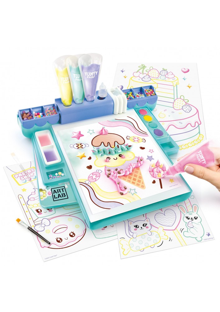 Inhoud: 1x creatief station, 1x penseel, 4x spuitmonden, 4x Fluffy Paint tubes (roze, geel, turquoise, paars), 6x zakjes met decoratieve elementen, 1x lepeltje, diverse lege en voorbedrukte kleurvellen