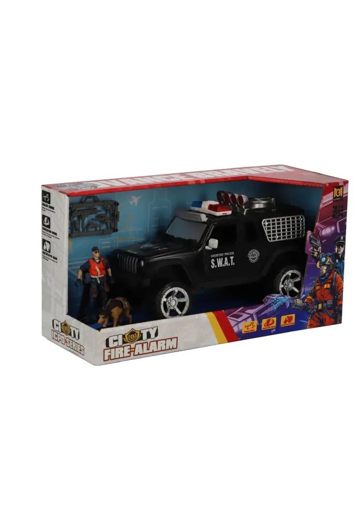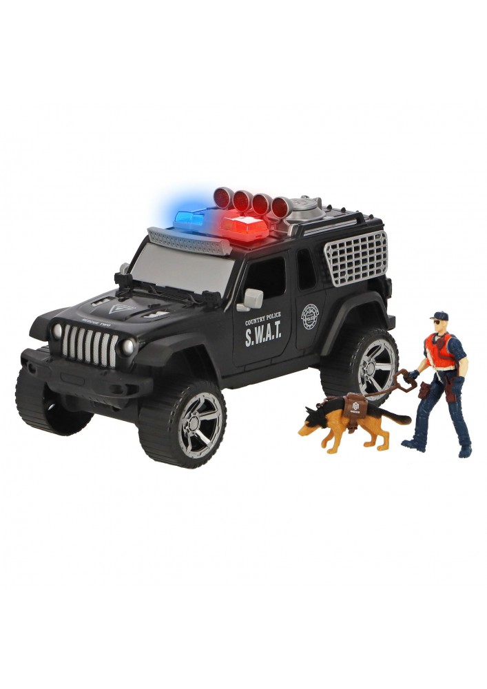 Politieauto met licht en geluid, politieagent, politiehond en accessoire