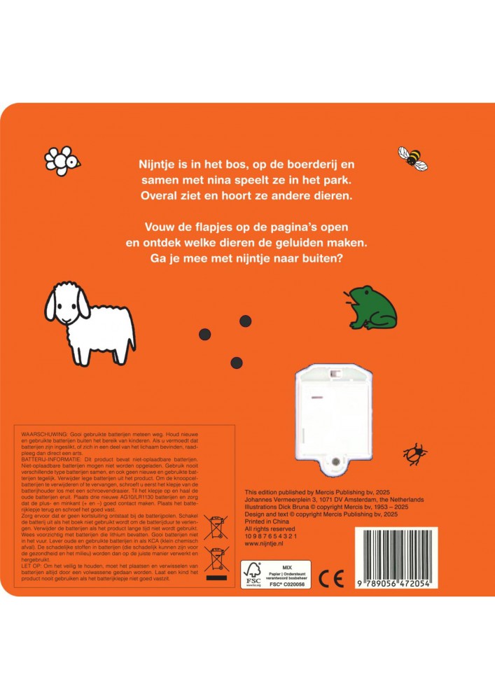 Nijntje is in het bos, op de boerderij en samen met nina speelt ze in het park. Overal ziet en hoort ze andere dieren. Een interactief geluidenboek voor de allerkleinsten. Open de flapjes op de pagina's en ontdek welke dieren de geluiden maken.