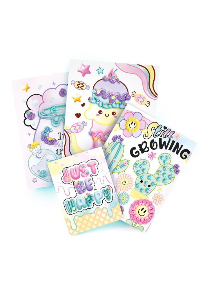 Inhoud: 1x creatief station, 1x penseel, 4x spuitmonden, 4x Fluffy Paint tubes (roze, geel, turquoise, paars), 6x zakjes met decoratieve elementen, 1x lepeltje, diverse lege en voorbedrukte kleurvellen
