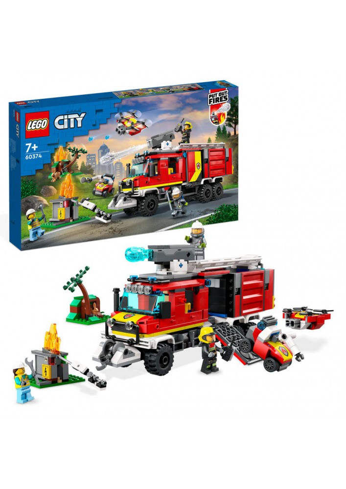 Laat de fantasie van kinderen ontvlammen met de LEGO City Brandweerwagen (60374). Deze zeer complete brandweerauto is uitgerust met een afneembaar controlecentrum en drones voor op het land en in de lucht. Kinderen kunnen verschillende elementen lanceren om water- en schuimblusacties uit te beelden. Voeg de brand in het bos en de stad en 3 minifiguren toe voor urenlang brandblusplezier boordevol actie! Bouwen en spelen voor kinderen vanaf 7 jaar Deze LEGO bouwset is inclusief stapsgewijze gedrukte bouwinstructies en de LEGO Builder app – een interactieve bouwhandleiding met intuïtieve zoom- en draaifuncties waarmee kinderen elk model van alle kanten kunnen bekijken terwijl ze het bouwen. Stimuleer de creativiteit LEGO City speelsets nemen kinderen mee naar een wereld vol actie. Ze bedenken zelf verhalen met de gedetailleerde gebouwen, realistische voertuigen en leuke personages die fantasierijk rollenspel stimuleren.