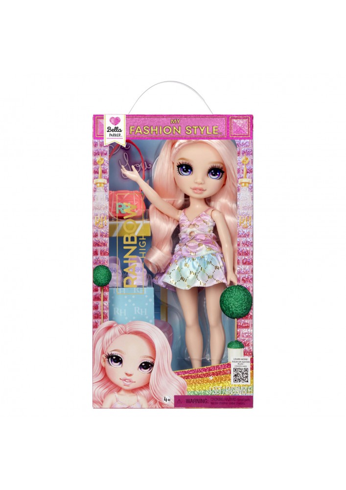 Modepop Bella uit de Rainbow High My Fashion Style-serie. Hoogte 28 cm. Inclusief outfit, schoenen en handtas. Gemaakt van kunststof en textiel. Geschikt vanaf 4 jaar.