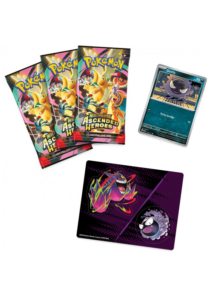 Mega evolueer je stickerset! Pokémon uit de Kanto-regio stijgen naar grote hoogten - zowel als promokaarten als techstickers! In deze collectie vind je Charmander of Gastly als foil promokaart, plus een vel techstickers met Gastly en Mega Gengar. Maak het helemaal af met nog meer Pokémon in drie boosterpacks uit de speciale Mega Evolution—Ascended Heroes-uitbreiding!