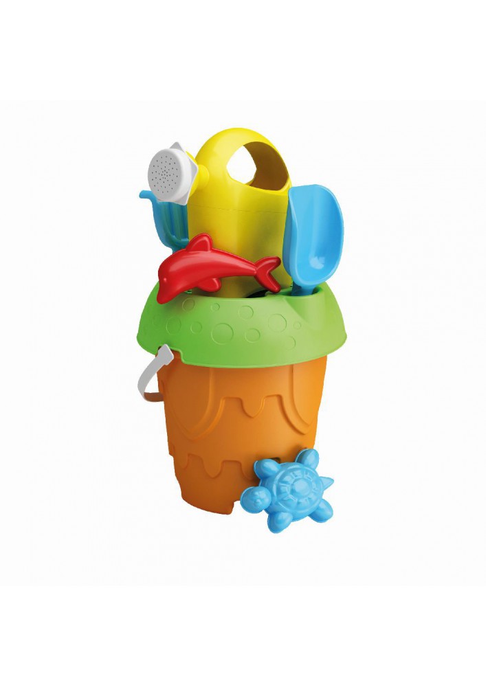 Zeven-delige strandset in de frisse kleuren oranje, groen, blauw, rood en geel. Hiermee kun je de mooiste zandkastelen bouwen! De strandset bestaat uit een kasteel-emmer met hengsel, zeef, gieter, harkje, schepje en twee zandvompjes. De emmer heeft een hoogte van 16 cm.