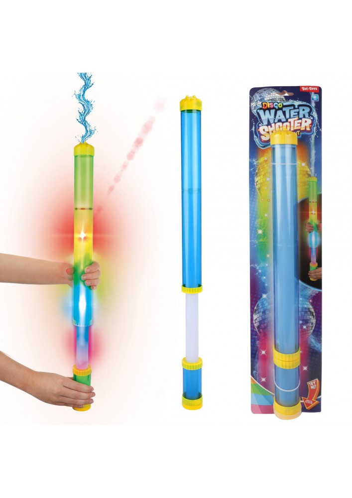 1x waterpistool/waterspuit 46 cm met blauw licht. Dit waterpistool geeft een blauw licht en werkt op 3 LR44 batterijen. De batterijen zijn exclusief. Materiaal: kunststof. U ontvangt 1 waterpistool/waterspuit. Waterspeelgoed van kunststof. Kinderspeelgoed voor buiten.
