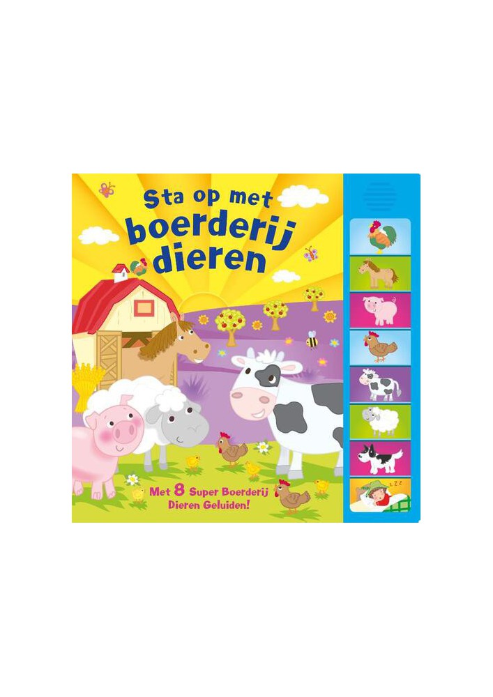 Geluidboek met 8 vrolijke boerderijdierengeluiden en kleurrijke illustraties.
