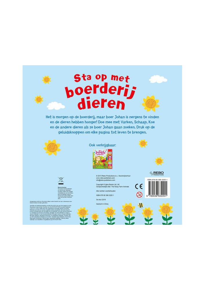 Het is morgen op de boerderij, maar boer Johan is nergens te vinden en de dieren hebben honger! Doe mee met Varken, Schaap, Koe en de andere dieren als ze boer Johan gaan zoeken. Druk op de geluidsknoppen om elke pagina tot leven te brengen.