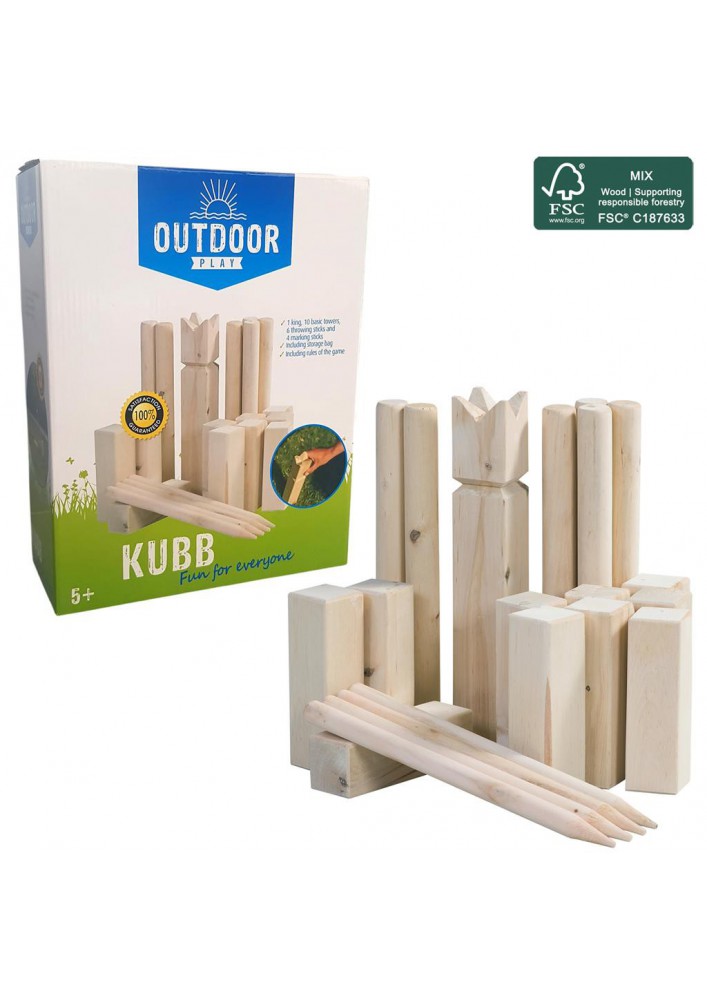 Outdoor Play Kubb Game. Versla de tegenpartij en werp met de werpstokken alle basistorens om! Probeer daarna de koning te verslaan en win het spel! Inhoud: 21 houten onderdelen. Afmetingen: 10 basistorens 4,5 x 4,5 x 15 cm, 6 werpstokken 3,3 x 3,3 x 31 cm, 4 markeerstokken 1,8 x 1,8 x 30 cm, 1 koning 5,3 x 5,3 x 31 cm. De onderdelen zijn vervaardigd van berken hout. Wordt geleverd in een FSC full-colour doos en bewaartas met uitgebreide handleiding. Geschikt voor kinderen vanaf 5 jaar.